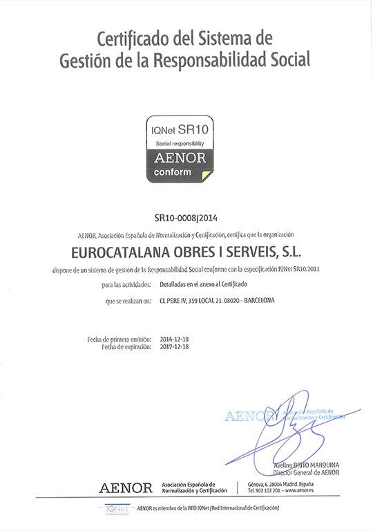 EUROCATALANA Obres i Serveis S.L. ha conseguido la Certificación de su Sistema de Gestión de la Responsabilidad Social según el estándar IQNet SR10 por parte de AENOR.